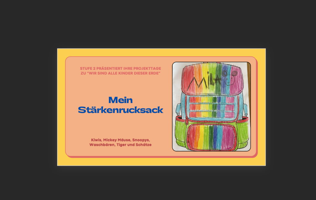 Unsere Projektwoche hieß „Wir sind alle Kinder dieser Erde“. Dafür haben wir unseren Stärkenrucksack gepackt. Das ist ein besonderer Rucksack. Da kommen keine Brotdosen…