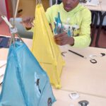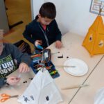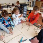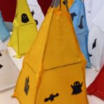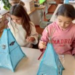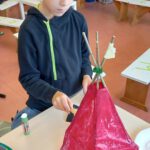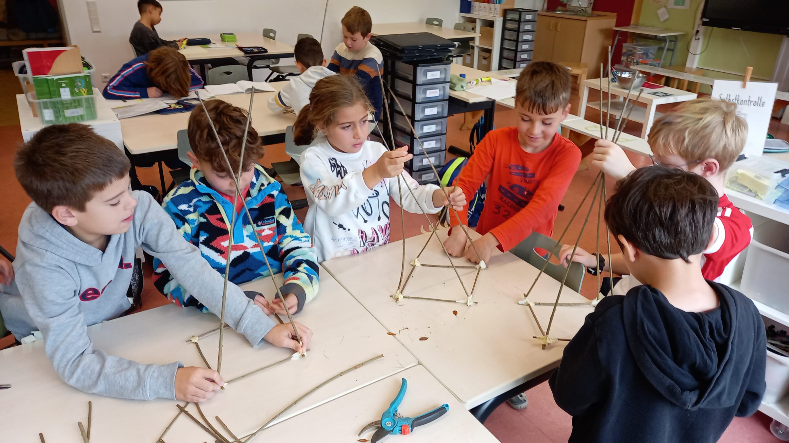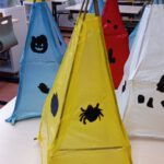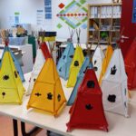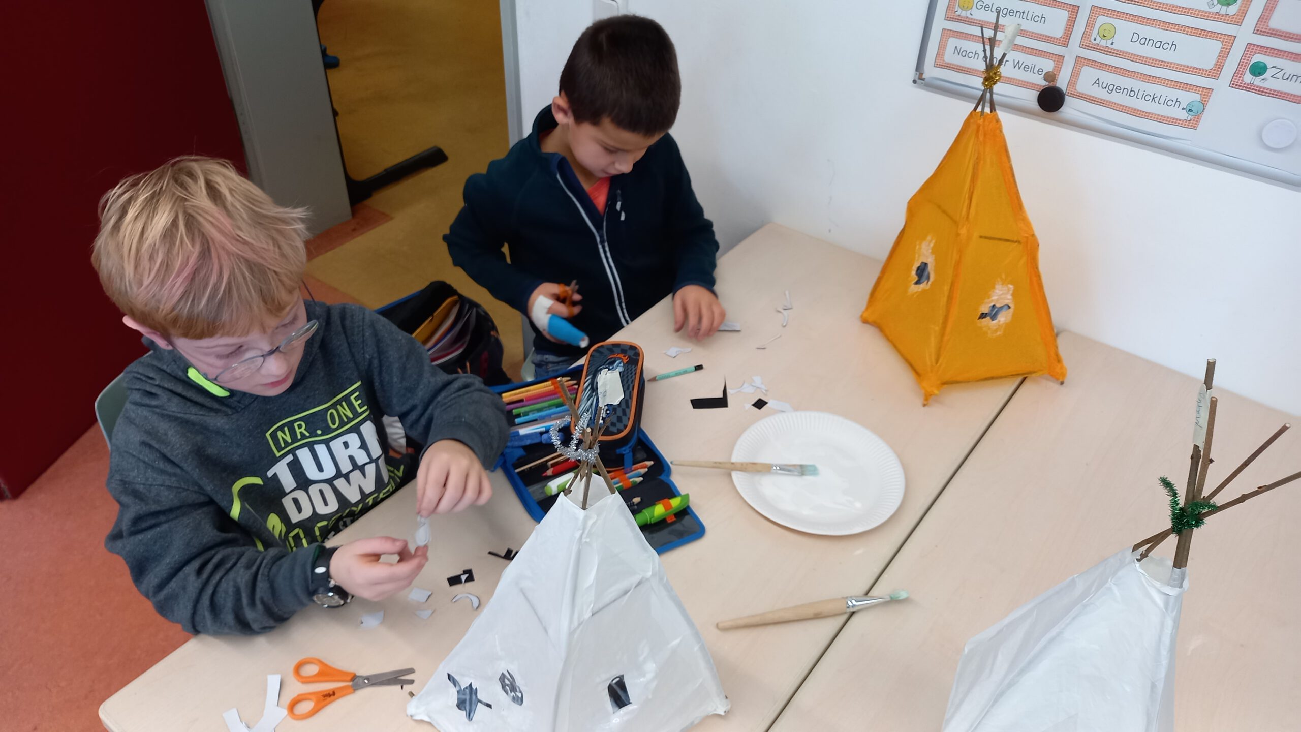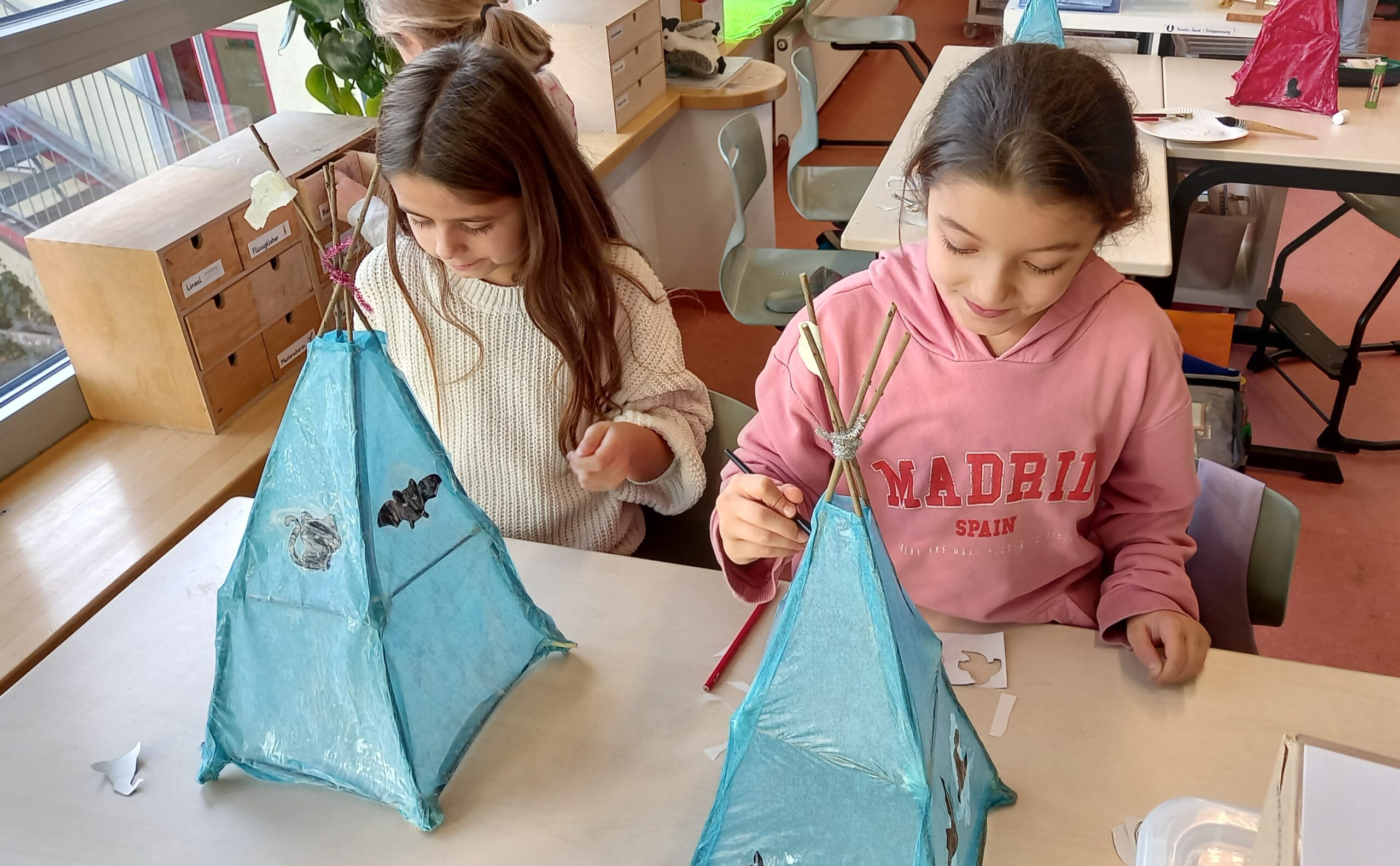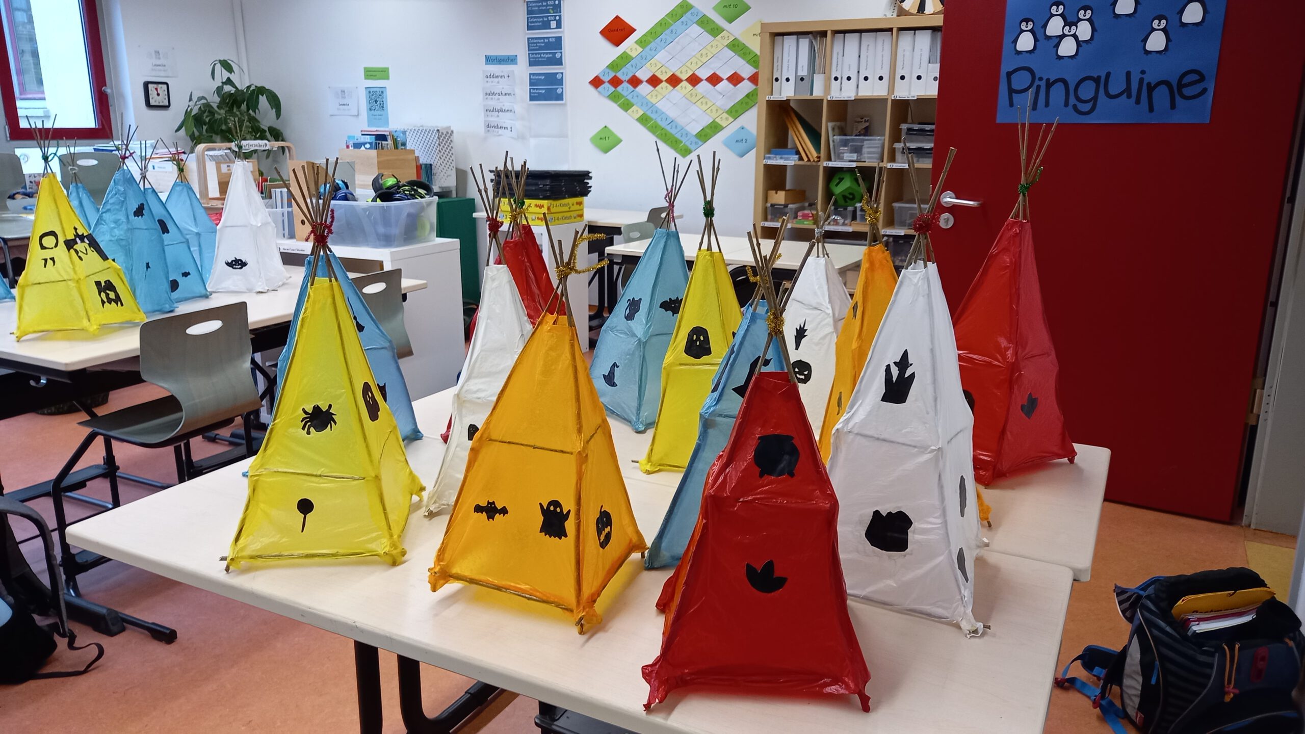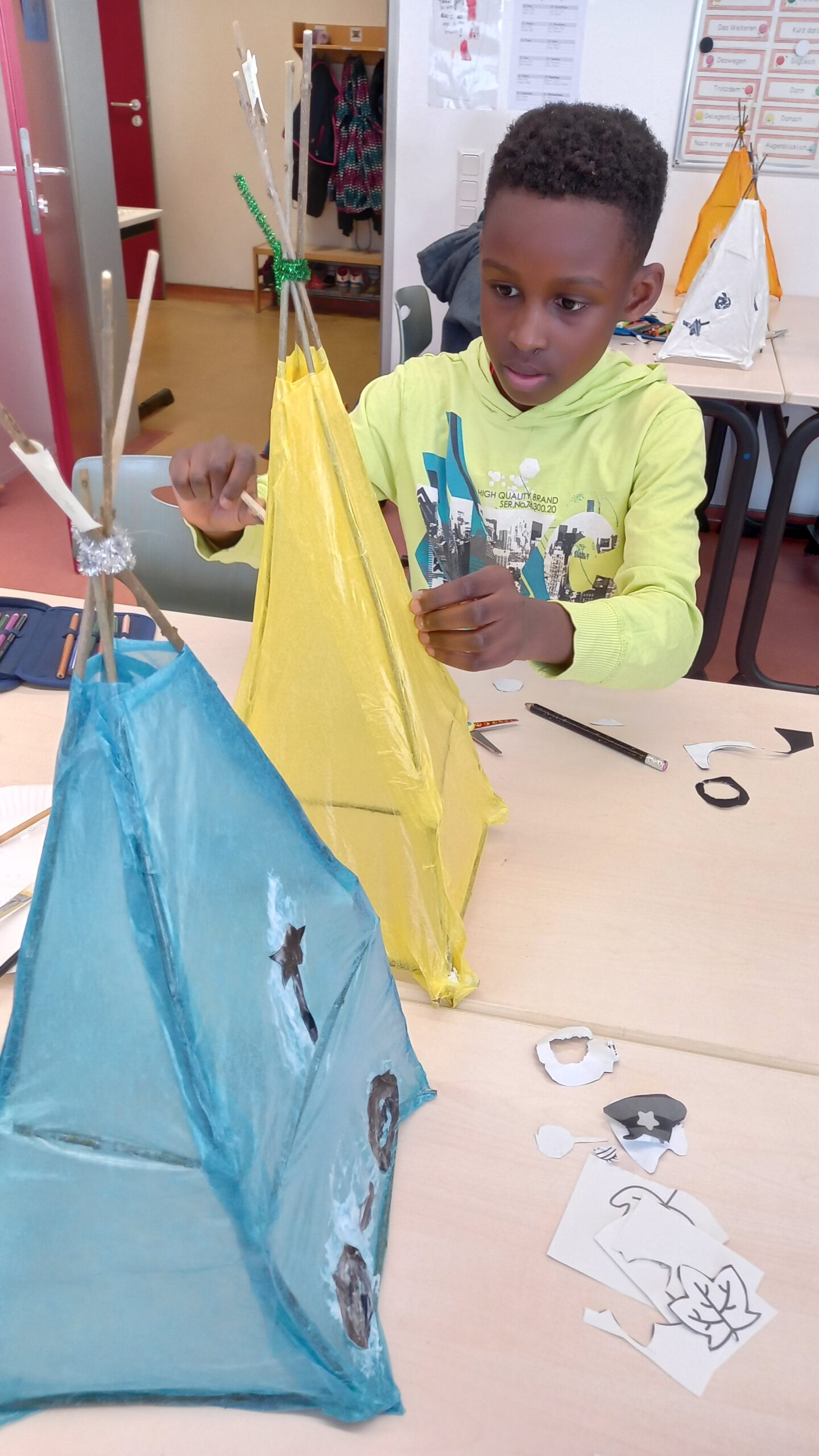 Die Pinguine gestalten aus Weidenstöcken und Zweigen ein Laternengerüst und überziehen dieses anschließend mit Transparentpapier. Aus Scherenschnittpapier schneiden sie herbstliche Motive aus und verzieren damit ihre Tipi-Laterne
