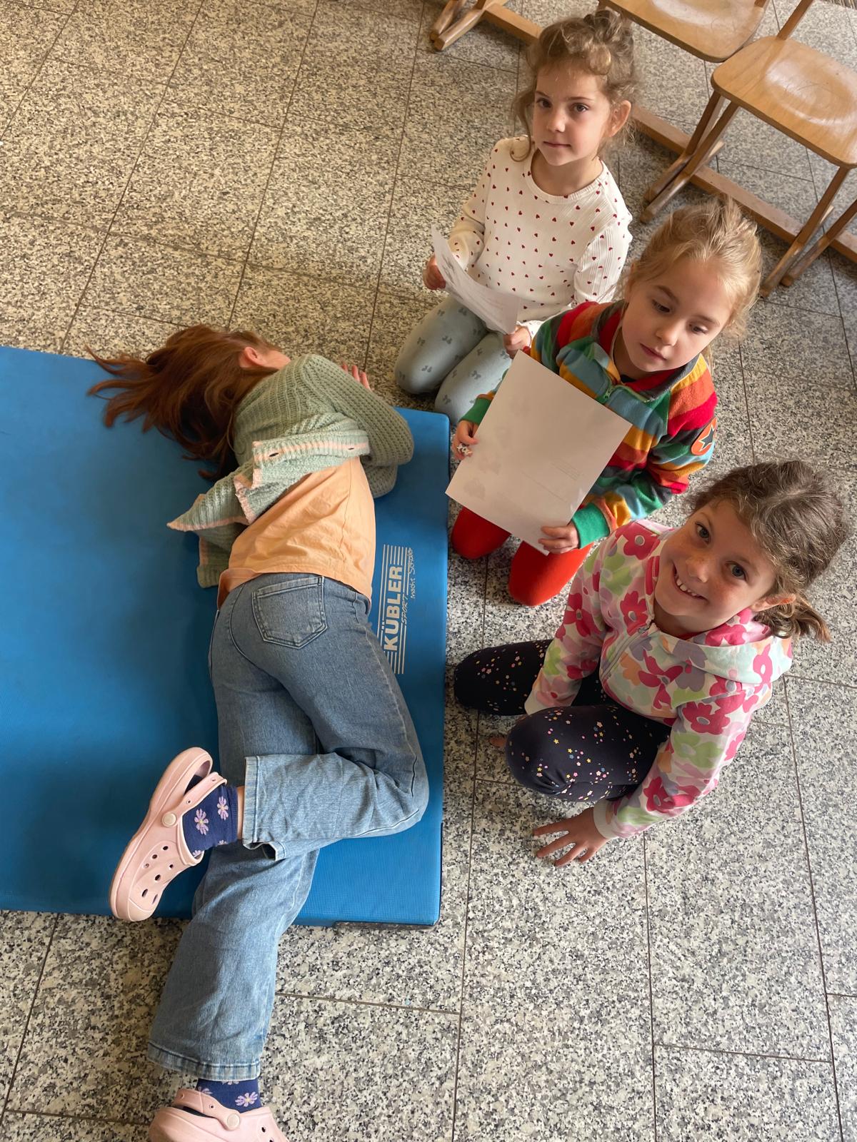In den letzten Wochen haben wir die stabile Seitenlage geübt. Das ist eine besondere Lage, in die man eine Person bringt, wenn sie bewusstlos ist, aber noch atmet. So kann die Person besser Luft bekommen und liegt sicher.