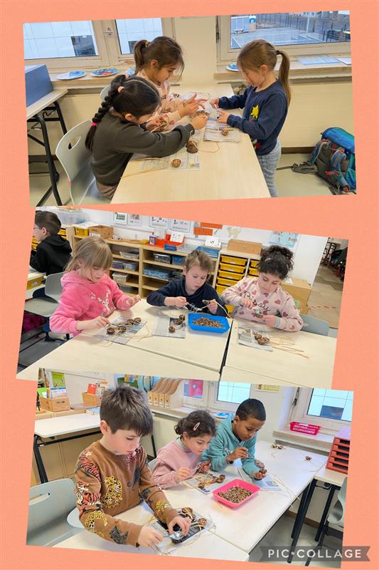Die Kinder haben halbe Walnussschalen mit Vogelfutter gefüllt, damit die Vögel, die bei uns überwintern, ein bisschen verwöhnt werden.