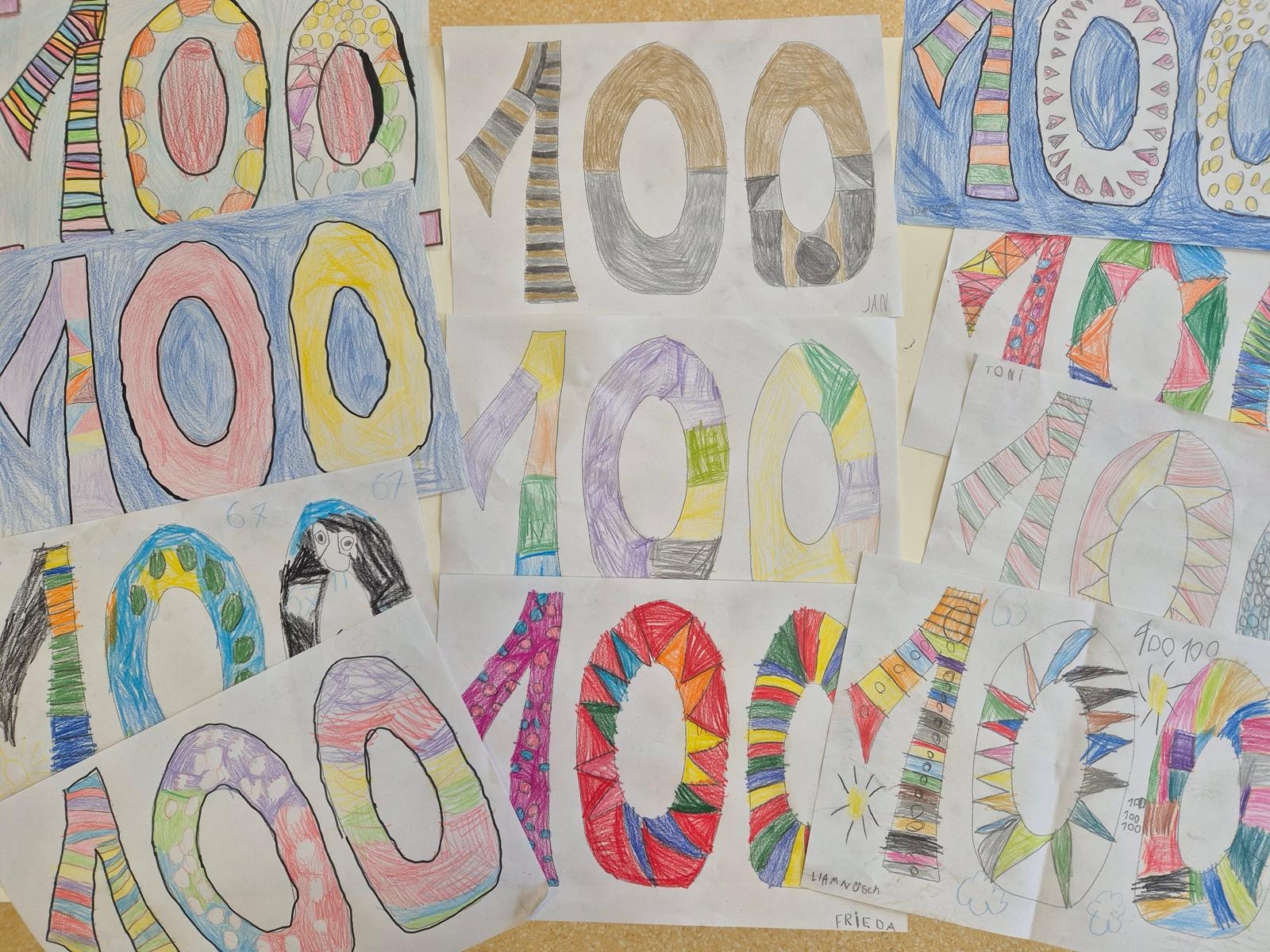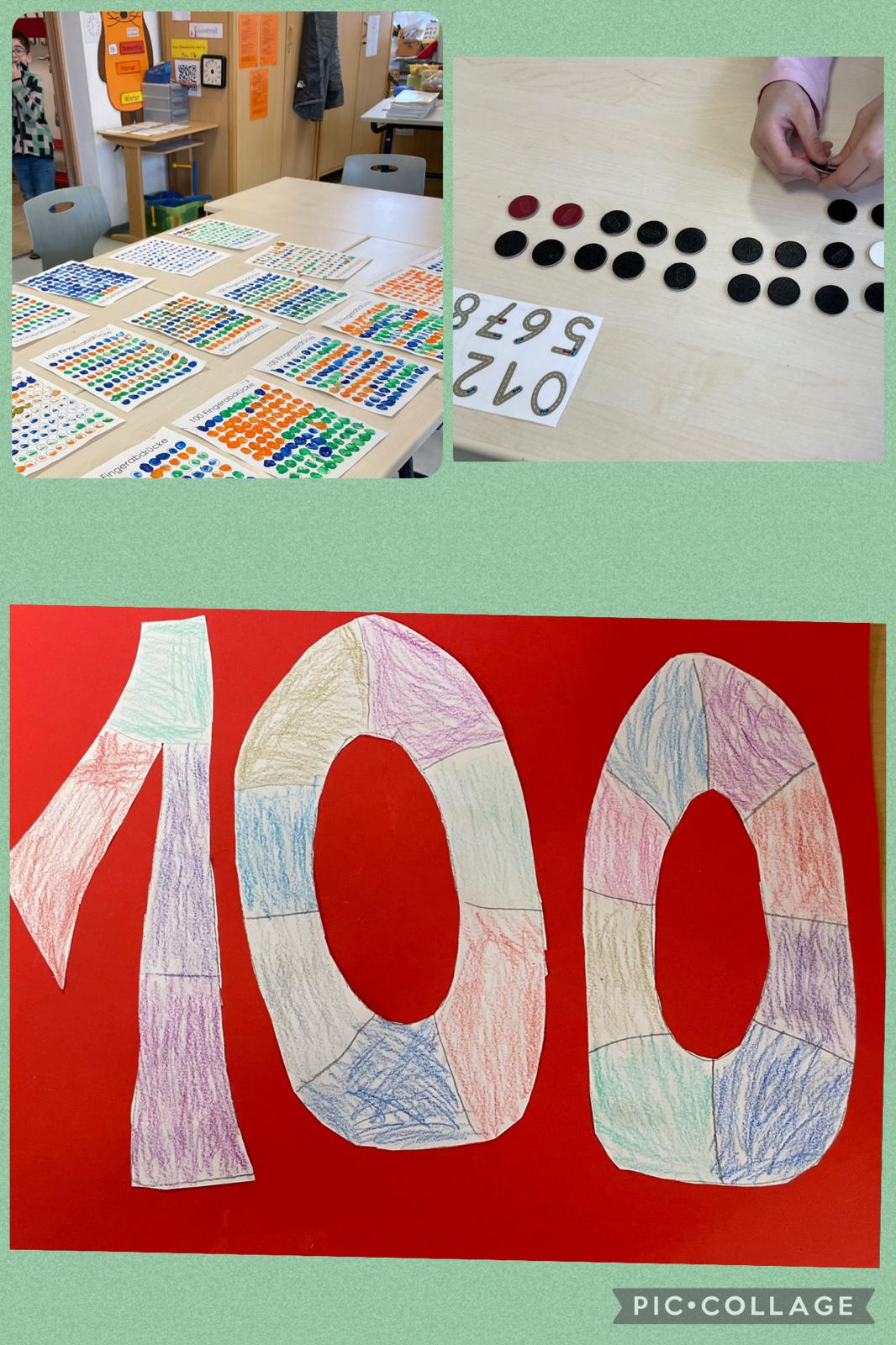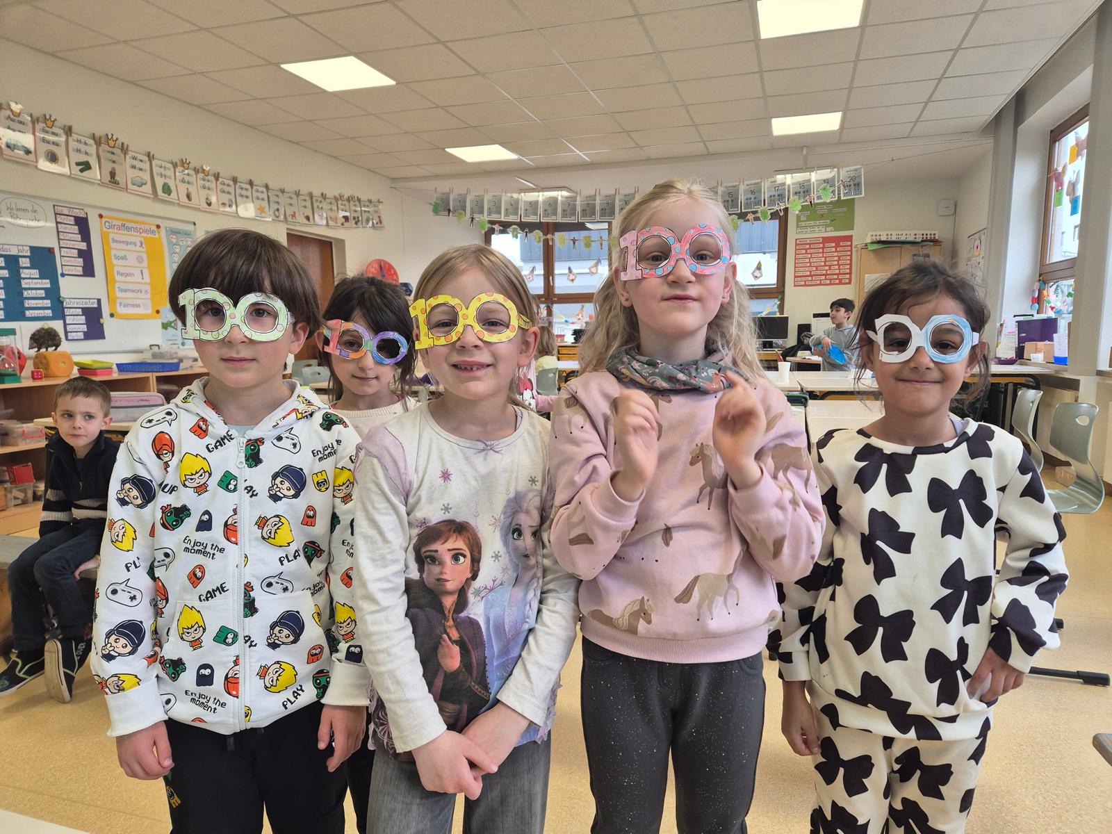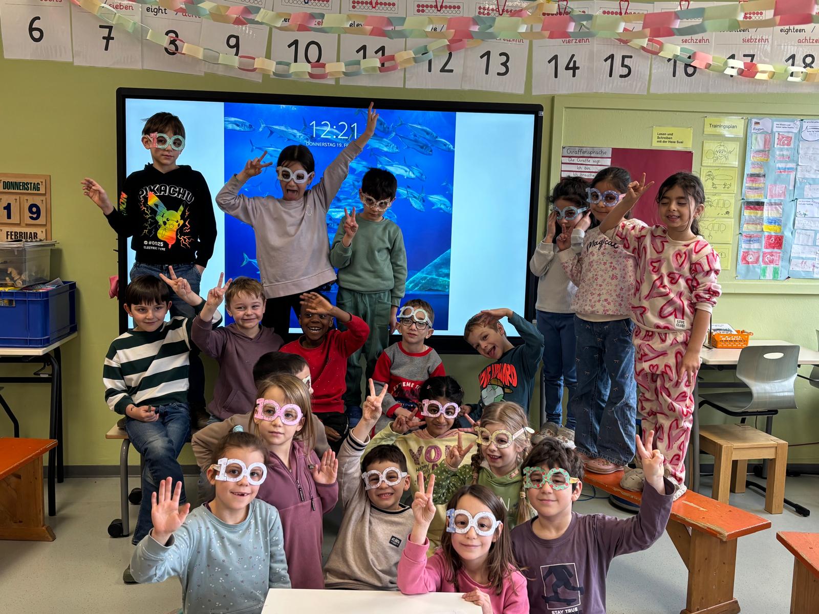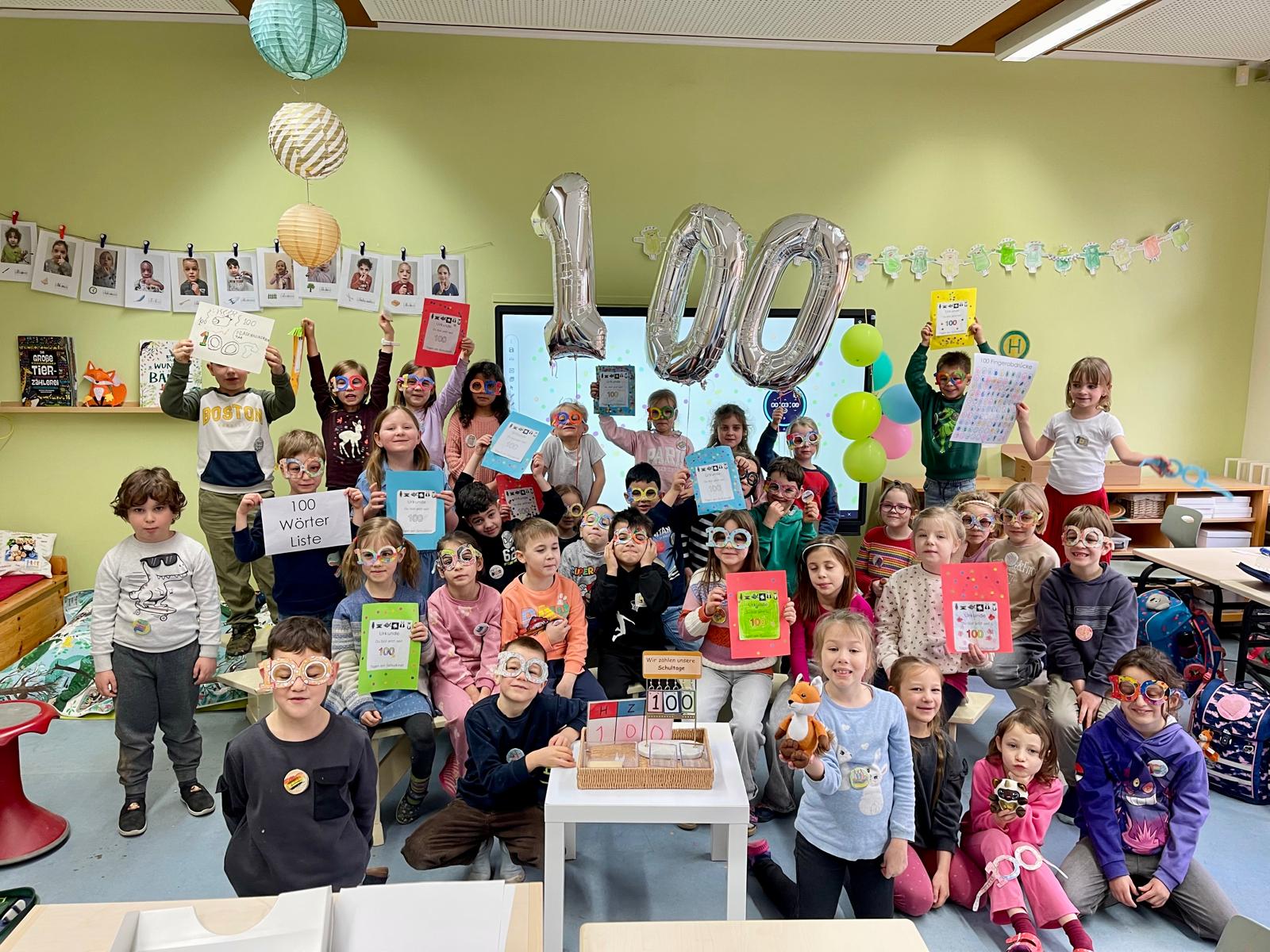 All die Dinge, die ihr bis jetzt gelernt habt, haben wir zum Anlass genommen, um im Februar mit allen ersten Klassen eine große 100-Tage-Schulkind-Party zu feiern. An eurem 100. Schultag gab es tolle und lustige Angebote für euch: vom Basteln einer stylishen Brille über 100x Hüpfen bis hin zum Schreiben von 100 Wörtern. Und klar, auch das Bauen ging nur mit 100 Bausteinen und Fingerabdrücke kamen im Hunderter-Pack. Es wurden Fotos gemacht, es wurde erzählt und viel gelacht, gemeinsam gespielt und vieles mehr.