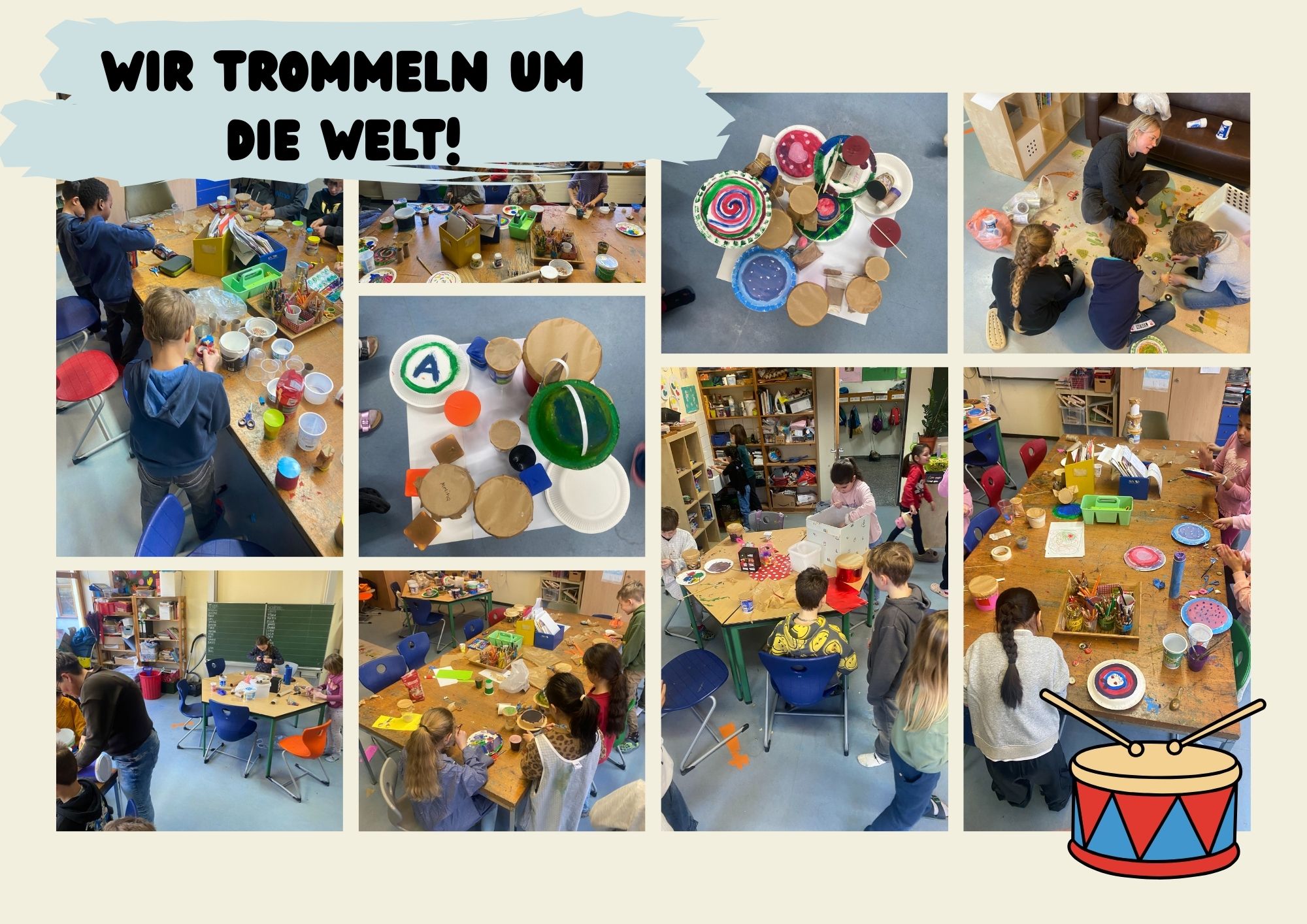 · Wir trommeln um die Welt: Hier wurde es laut! Wir haben Trommeln und andere Musikinstrumente aus aller Welt gebastelt und verschiedene Rhythmen aus der ganzen Welt ausprobiert.